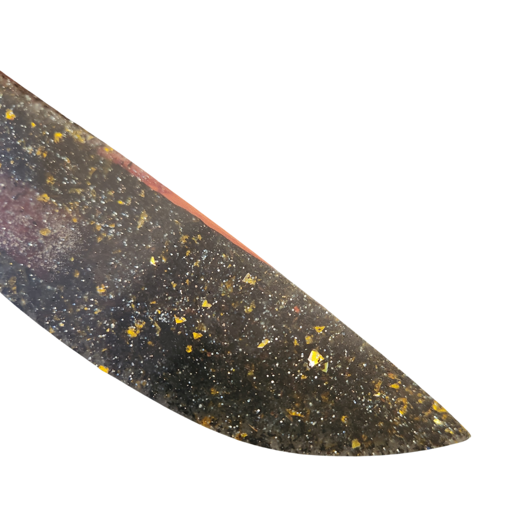 This knife is a striking blend of materials. The dark, speckled blade has a natural, handcrafted feel, while the wooden handle boasts a smooth finish and elegant grain pattern.