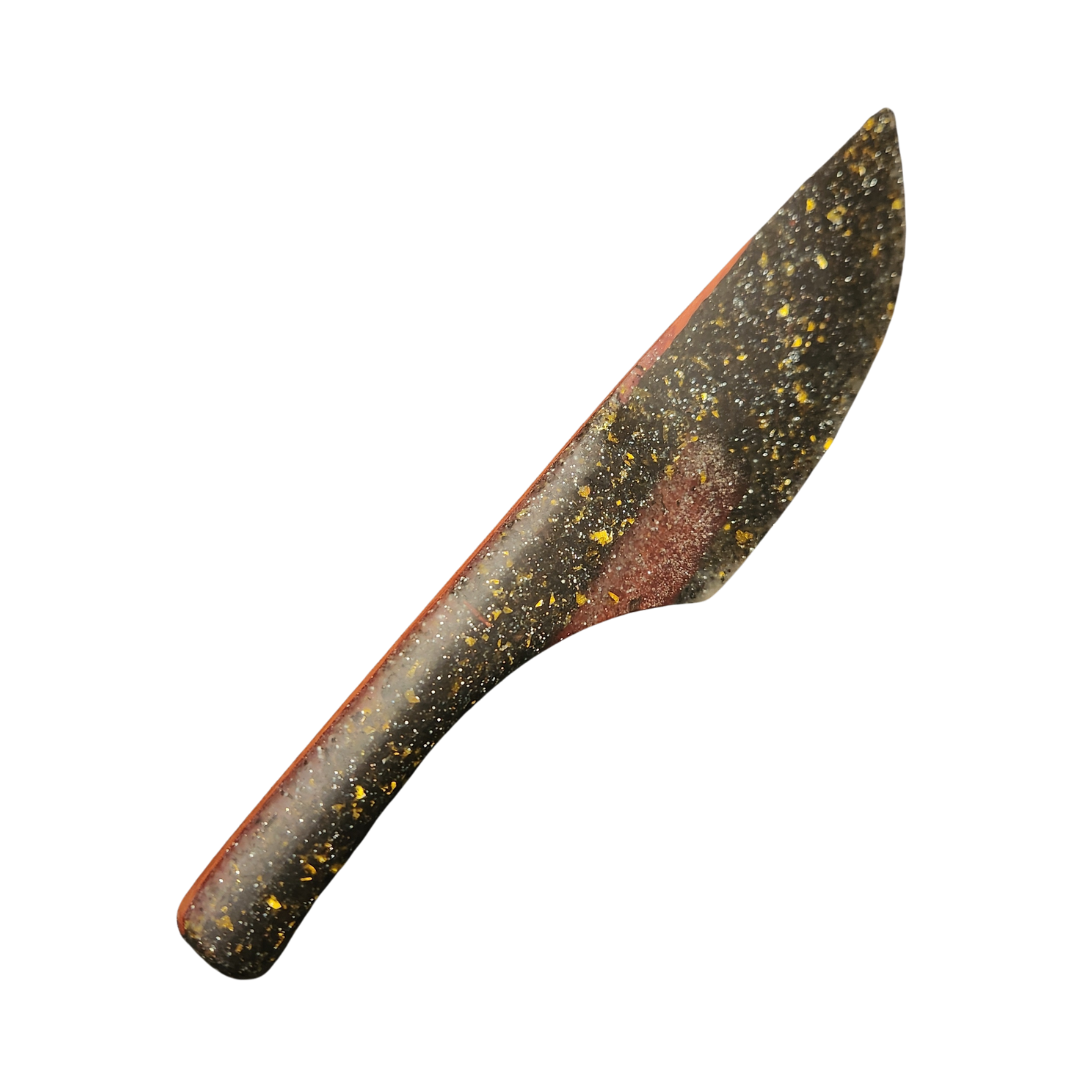 Description: Introduce a touch of rustic elegance to your cheese board with this exquisite cheese knife, featuring a dark, speckled blade and a finely crafted wooden handle. Each piece is a testament to artisanal craftsmanship and nature's beauty.
